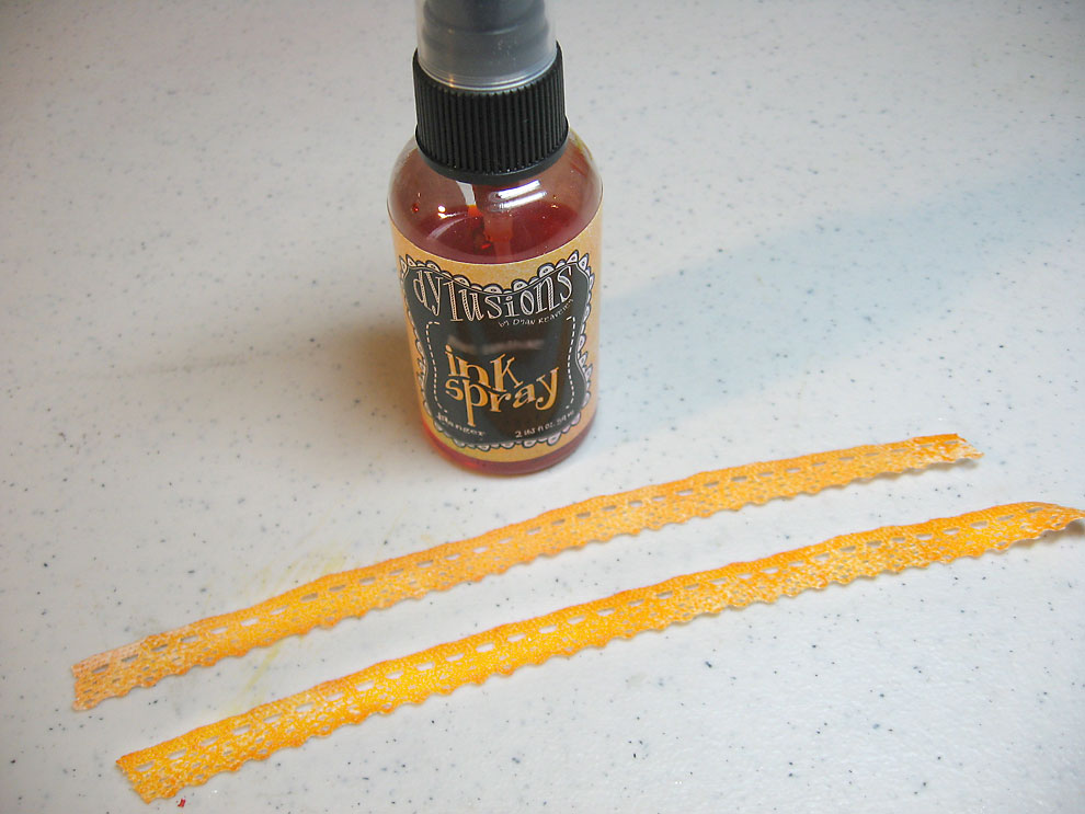 I colored pieces of white lace trim with Dylusions sprays, first with Lemon Zest, then lightly with Pure Sunshine. After heating the lace to dry it, the color faded softly and matched my tag nicely.