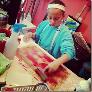 I can not take all the credit folks! I have been in a creative slump, possibly because it’s summer and we have been fortunate here in eastern Kansas to have some wonderful summer weather with only a couple of days of hot and humid temperatures sprinkled in. A couple of months ago, my oldest granddaughter spend a Saturday with me in my art room. I showed her how to create background prints using just paint, brayer, some sprays and of course paper.